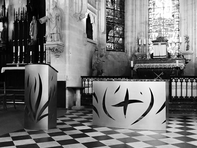 Pourquoi parler d’aménagement plutôt que de mobilier liturgique ? Parce que tous mes différents projets m’ont montré que, bien sou- vent, il ne s’agit pas seulement des éléments essentiels que sont l’autel, l’am- bon, le tabernacle, etc. Mais d’un regard sur une totalité. De la même façon qu’une sculpture a besoin d’espace autour d’elle pour chanter et se retrouve diminuée d’une partie de sa puissance expressive si on la plaque contre un mur, de même, le mobilier liturgique a besoin, autour de lui, de silence, de lumière, du vide respectueux et majestueux qui manifeste, lui aussi, quelque chose de Dieu. Depuis des années maintenant, mon approche d’un chœur ou d’une église, est globale. Le mobilier, certes, mais aussi les murs, le sol, les objets, la lumière, la hauteur, la profondeur. Il s’agit de l’aménagement liturgique du sanctuaire. C’est l’espace de Dieu. Là où Il se donne.