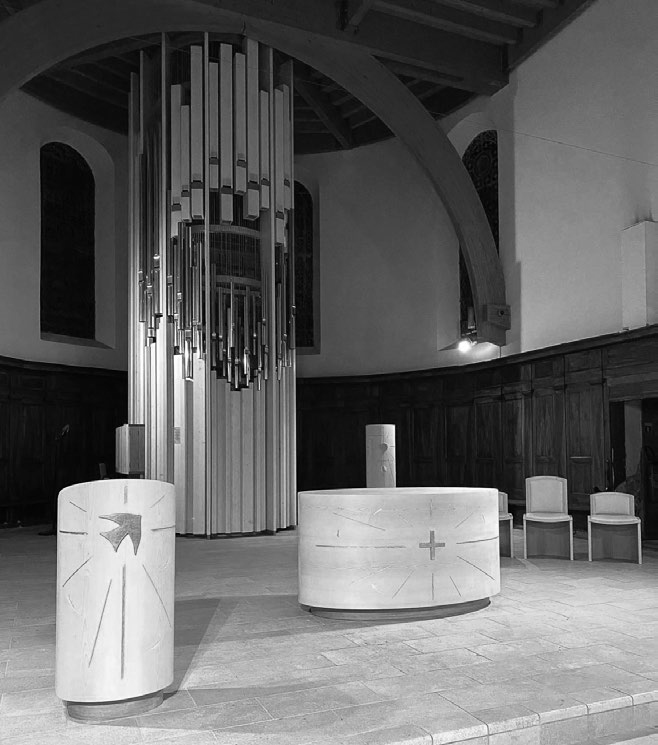 Enfin, bien sûr l’on peut essayer de penser un nouveau mobilier. Pour nombre de paroisses c’est trop impressionnant pour oser se lancer, car en effet, des œuvres pièces uniques ont un coût. Or, sur tous les projets que j’ai réalisés dans ma vie, un seul avait les fonds au départ. Tous sont allés en quête de dons, et cela a fonctionné à chaque fois. D’abord parce je crois profondément que la Providence veille. Et aussi parce que les gens se mobi- lisent autour de leur pasteur et de leur église pour continuer d’être bâtisseurs aujourd’hui. Et comme dans toute entreprise humaine où l’on s’engage et se donne du mal, le fruit est d’autant plus chéri. C’est aussi parce que dans ce typer de projet, on créé un patrimoine qui nous survivra dans le temps et qui sert une réalité plus haute.